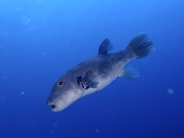 近くに寄ってくるモヨウフグで戯れていたら…。